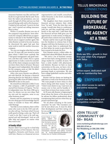 insurance business was like and how dif- representative and wealth consultant, ficult it is to get started. But he said, ‘If you while Kenyatta is the firm’s marketing have the talent and persistence, you can support specialist. push through all of that and you can find “My daughters have been around the yourself doing really well in this business.’ financial services industry their whole I looked at him and said, ‘I want to be that lives,” he said. “From the time they were guy.’ And I started out selling insurance young, I would take them to conferences door to door.” with me, and they would help work the Within 12 months, Royster was one of booth in the expo hall. I told them that the company’s top producers. Soon after- the financial services field gives you the ward, the company offered him an oppor- opportunity to make money, to help peotunity to relocate to the Norfolk/Virginia ple and to have control over your destiny.” Beach area to support another agent. But Royster said he tries to give his daughwhen Royster arrived in his new location, ters the freedom to criticize him if they he discovered the agent had quit that disagree with how the business is run. Yet same week to work for another insurance he also wants them to understand that company. as their father, he wants to give them his “So, you can imagine what that was like best counsel as he leads the firm. for me, 25 years old, just moved to some First Genesis serves a white-collar clisee 10%+ BGAs see 10%+ in growth their in their place where I didn’t knowBGAs anybody. But entele that’s about 90% Black, Roystergrowth said. I had good management and good men- year “We servewhen a lot of business owners, first fullyfirst engaged year when fully engaged tors, and they said, ‘Listen, this is a great and we have had a strong presence in the with Tellus with Tellus opportunity to make a name for yourself. clergy market for a number of years. We Now all the client company accounts that have a niche market with pharmacists are down there, they’re all yours.’ Because and dentists. Because we have so many that agent wasn’t independent. He worked universities in this area, we have a lot of for the company, same as I did. He didn’t clients who are deans of schools and deexpert, dedicated Utilize expert,staff dedicated staff own the book of business.”Utilize partment heads at universities. We also After a few years, Royster was offered a no have college basketball coaches and referwith membership withfees no membership fees job with MetLife. He became a financial ees as clients.” planning director for MetLife in Atlanta, Royster said his clients are looking for growing his office from $75,000 in fees to education as well as for financial services. $500,000 in fees in five years. “We want people to know what it is that He retired from MetLife in 2016 (“I owe they’re doing with their money,” he said. Gain Gaincarriers direct access to carriers that company a debt of gratitude”) and direct “I don’t want clients access to say, ‘I just turn my to and and online resources started First Genesis of Virginia. “I’m ful-online money over to himresources and he handles it.’ I ly independent now. But from 1996 up to want them to know how money works.” now, I’ve always run my own shop. Paid At 59 years old, Royster is beginning to my rent and my expenses, same as any think about the future of his practice as other business owner.” he advises his fellow professionals about Royster said his experience in running transitioning their practice when they apExploit new technology Exploit newand technology and his own shop gave him knowledge that he proach retirement age. competitive compensation competitive compensation wants to transfer to those who affiliate “It’s all about investing in the junior with Heritage. associate,” he said. “The transition can“Just like in every industry, there will be not be just about you. It must be about some who want to be the CEO and oth- their development and their taking over ers who will say, ‘You know what? I’m just for you and their being not you but better really good at being a sales rep. That’s all than you.” I want to do. But I want to be well supported and well developed.’ And we will Susan Rupe is manoffer help and support no matter what aging editor for InsuranceNewsNet. they want to do.” She formerly served as communications www.marketing.tellusbrokerage.com www.marketing.tellusbrokerage.com