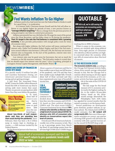 The recession ended in July, according to the Chicago Fed National Activity Index, whose three-month average rebounded sharply in July. But the Chicago Fed is cautious about issuing an all-clear signal on the end of the recession, as U.S. economic activity has been especially volatile in the wake of the COVID-19 pandemic. 1 IN 4 The July surge for this broad VIEWS measure of U.S. economic activECONOMY ity marks the highest reading, by 4 in 10 consumers report the FAVORABLY economic downturn has impacted far, in the index’s 50-year-plus their discretionary spending and Consumers history based on the threetheir ability to save for retirement. continue to be month average. Meanwhile, the SOURCE: LIMRA divided about Philadelphia Fed’s ADS Index how they view the economy and COVID- has signaled for several months that the 19, based on their political ideology, nation’s economy is on the bounce back. LIMRA said. The most recent LIMRA Several predictions on third-quarter Consumer Sentiment Survey showed 78% gross domestic product indicate an upof those who identify as liberals report beat outlook. The Atlanta Fed’s GDPNow a high level of concern about COVID-19, model estimates that Q3 output will whereas only 44% of consumers who surge nearly 26%. But even if these optiidentify as conservatives report this mistic estimates are correct, one quarter level of concern. of strong GDP growth will still leave the Overall, just 25% of Americans had a fa- economy with only a partial recovery afvorable view of the economy in July. This ter the record 32.9% GDP drop in Q2. is up 4 percentage points from March but down 31 percentage points from the all-time high of 56% (since LIMRA began About a quarter of Americans said they’ve been unable to pay at least one bill because of the pandemic, and 17% said they have been unable to pay multiple bills. Overall, about half of those surveyed said they have experienced some type of household income loss.