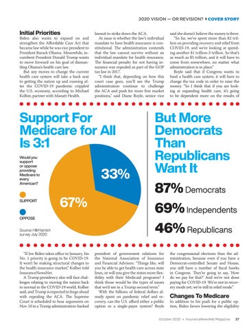 lawsuit to strike down the ACA. At issue is whether the law’s individual mandate to have health insurance is constitutional. The administration contends that the law cannot survive without an individual mandate for health insurance. The financial penalty for not having insurance was repealed as part of the GOP tax law in 2017. “I think that, depending on how this court case goes, you’ll see the Trump administration continue to challenge the ACA and push for more free market positions,” said Diane Boyle, senior vice
