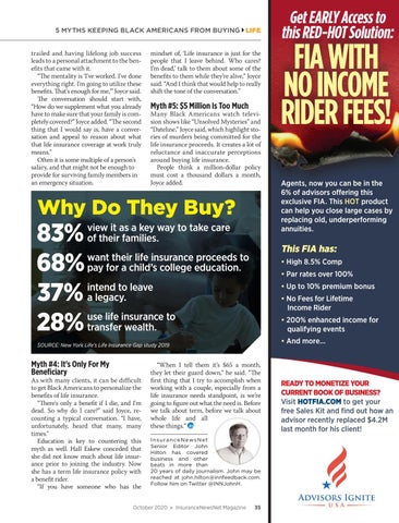 “When I tell them it’s $65 a month, they let their guard down,” he said. “The first thing that I try to accomplish when working with a couple, especially from a life insurance needs standpoint, is we’re going to figure out what the need is. Before we talk about term, before we talk about whole life and all these things.” I n s u r a n c e N ews N e t Senior Editor John Hilton has covered business and other beats in more than 20 years of daily journalism. John may be reached at john.hilton@innfeedback.com. Follow him on Twitter @INNJohnH.