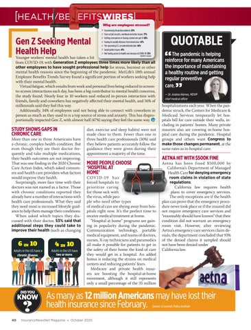 from COVID-19, with Generation Z employees three times more likely than all other employees to have sought professional help for stress, burnout or other mental health reasons since the beginning of the pandemic. MetLife’s 18th annual Employee Benefits Trends Survey found a significant portion of workers seeking help with their mental health. Virtual fatigue, which results from work and personal lives being reduced to screento-screen interactions each day, has been a big contributor to mental health concerns, the study found. Nearly four in 10 workers said reduced in-person interaction with friends, family and coworkers has negatively affected their mental health, and 56% of millennials said they feel this way. Additionally, 34% of employees said not being able to connect with coworkers in person as much as they used to is a top source of stress and anxiety. This has disproportionally impacted Gen Z, with almost half (47%) saying they feel the same way.