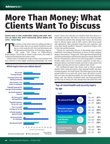 Next, we sought to identify topics of current concern for clients. From a list of 25 topics, survey respondents professional. Most have discussed financial matters, chose the five that best represent what is most Clients want to feel comfortable talking with their advi- found. Clients who said they are satisfied with their advisor reincluding plans for and how to manage on their The results are divided into three sors on topics thatretirement aren’t necessarily about dollars and lationships said mind. they still want to discuss their financial plans RE 1 their cents. • Susan Rupe also report discussing job for retirement how they manage theirand money. But they also and money. Some overarching themes—health security; wealth Among health-andand security-related topics, “personal want to discuss topics such as their careers, their future goals h topics have you talked about? transitions and housing expenses forbeyounger family lifestyle; family loved ones—with a focus health”and was mostand frequently across he advisor of the future must willing and able tophysical and aspirations, their potential long-term careselected expenses, and on discusspeople topics that arediscussed not purely financial, accord- even their family members’ said Kevin Hogan, CEO members. Fewer have their own variances betweenfinances,” age groups. with older respondents (ages 61-75) ing to a new study by AIG Life and Retirement andageofgroups, AIG Life and Retirement. My current health, theirthe family’s health, or identity protection Massachusetts Institute of Technology AgeLab. especially “Clientslikely are expressing interest in discussing topics interest beyond to choose it (Figure 2). Also, housing situation The study, “The1),Future of identify Client-Advisor and scam prevention (Figure yet they these traditional conversation boundaries in favor of wider-ranging, expenses, and identity protection Relationships,” found that as clients’ needs evolve, the model ofin care-related deeper conversation,” Hogan said. “Although financial planning,and Health and d prevention and asatop-of-mind topics. financial professional also must evolve. portfolio performance and financial expertise remain important