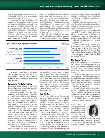 Key Take-Away: Having discussions about a more money set “isofbroadening the client/advisor expertise, product fit and knowing the holistic topics that move beyond purely financial relationship andtopresenting an opporalone. Clients want you to know can be important clients and may strengthennumbers the tunity for a more transparent, holistic them before being given permission to bond. Even for topics that did not produce significant approach to financial and future plan- serve them.” effects on client satisfaction, having a conversation ning,” Hogan said. “While no one expects Coughlin said the research makes it about themadvisors did not appear erode client financial to be antoexpert on allsatisfaction; clear that all clients are changing and that therefore, broadening the conversation carriesthere more is a “new generation gap out there topics, they have the opportunity to help their clients identify of concern that is all about expectations.” positive potential thanareas negative risks to and relationships, thencan connect into broader Younger consumers, he said, have aland have them an important role innetworks deepening client of expertise.” ways had a wealth of information and relationships over time. The study also looked into the ways advice — from teachers to SAT prep tuand frequency in which clients commu- tors to career coaches to having access to nicate with their advisor. One takeaway an online world that provides them with opinion and direction on nearly every aspect of their lives. Source: AIG and “They are now expecting that the proMIT Age Lab fessionals they work with to ensure their financial security know them much like a friend and, like a friend, to have their back guiding them throughout their life course, not just at periodic financial decision points,” he said.