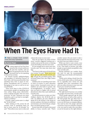 o many aspects of our lives have moved to the virtual world over the past few months, and our eyes are paying the price for the increased time we are spending in front of our screens. Dr. Daniel Laroche, ophthalmologist and president of Advanced Eyecare of New York, told InsuranceNewsNet that spending more time in front of computers, smartphones and TV screens is damaging to our eyes as well as to our overall health. “Since we’ve been in this COVID-19 environment, people are spending more time online, doing more videoconferences, working virtually. This can cause eyestrain,” he said. “Eyestrain can cause headaches, and it can lead to nearsightedness in children.” Laroche urged screen-users to adopt the “20-20-20 rule.” “After looking at the screen for 20 minutes, look at something that’s 20 feet or more away for 20 seconds,” he said. “That allows your eyes to relax and 50