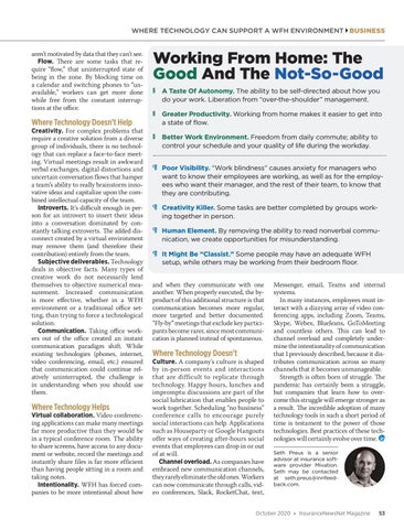 Messenger, email, Teams and internal systems. In many instances, employees must interact with a dizzying array of video conferencing apps, including Zoom, Teams, Skype, Webex, BlueJeans, GoToMeeting and countless others. This can lead to channel overload and completely undermine the intentionality of communication that I previously described, because it distributes communication across so many channels that it becomes unmanageable. Strength is often born of struggle. The pandemic has certainly been a struggle, but companies that learn how to overcome this struggle will emerge stronger as a result. The incredible adoption of many technology tools in such a short period of time is testament to the power of those technologies. Best practices of these technologies will certainly evolve over time. Seth Preus is a senior advisor at insurance software provider Mivation. Seth may be contacted at seth.preus@innfeedback.com.