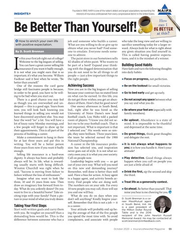 »G o to bed early and get up early. »D o not accept any space between what you say and what you do. »B e where your feet are (especially with family members). »B e upbeat. Abundance is a state of mind. It is impossible to be thankful and depressed at the same time. »D o great things, think great thoughts and delegate the rest. » I t is not always what happens to you; it is how you handle it. How’s your attitude? »P lay detective. Good things always happen when you call on people you are just a little afraid of. »D rink the first, sip the second and skip the third. »T reat life as a generosity contest. »G o ahead. Be better than yourself. That noise you hear is me cheering for you. D. Scott Brennan is a career MassMutual agent in South Bend, Ind. He is a past president of the Million Dollar Round Table and is the 2016 recipient of the John Newton Russell Memorial Award. He may be contacted at scott.brennan@innfeedback.com.