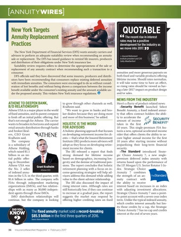 The There recent are 11rise companies in interest offering rates may be a positive QLAC (qualifying longevity annuity development for the industry contract) products. While this isas we move into 2017. a small and new part of the DIA market, we expect to see an uptick — Insured Retirement in sales in 2016. Institute president and CEO Cathy Weatherford