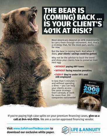THE BEAR IS (COMING) BACK … IS YOUR CLIENT'S 401K AT RISK? Most Americans depend on 401k investments to carry them through retirement. And, that’s a strategy that, for the most part, works — for now. But the bear is coming back. And when it does, your clients’ savings could be gutted. Why not be the advisor to buck the trend and show your clients how to preserve their nest egg: • WITHOUT paying ANY taxes • WITHOUT facing massive penalties • EVEN IF they’re under 59½ and still employed! In less than 5 minutes — and without spending a dime — you can help your clients access the same strategy that’s already at work for more than 200 companies nationwide!
