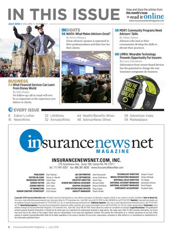 Copyright 2018 InsuranceNewsNet.com. All rights reserved. Reproduction or use without permission of editorial or graphic content in any manner is strictly prohibited. How to Reach Us: You may e-mail editor@insurancenewsnet.com, send your letter to 275 Grandview Ave., Suite 100, Camp Hill, PA 17011, fax 866.381.8630 or call 717.441.9357. Reprints: Copyright permission can be obtained through InsuranceNewsNet at 717.441.9357, Ext. 115, or reprints@insurancenewsnet.com. Editorial Inquiries: You may e-mail editor@insurancenewsnet.com or call 717.441.9357, ext. 117. Advertising Inquiries: To access InsuranceNewsNet Magazine’s online media kit, go to www.innmediakit.com or call 717.441.9357, Ext. 115, for a sales representative. Postmaster: Send address changes to InsuranceNewsNet Magazine, 275 Grandview Ave., Suite 100, Camp Hill, PA 17011. Please allow four weeks for completion of changes. Legal Disclaimer: This publication contains general financial information. It should not be relied upon as a substitute for professional financial or legal advice. We make every effort to offer accurate information, but errors may occur due to the nature of the subject matter and our interpretation of any laws and regulations involved. We provide this information as is, without warranties of any kind, either express or implied. InsuranceNewsNet shall not be liable regardless of the cause or duration for any errors, inaccuracies, omissions or other defects in, or untimeliness or inauthenticity of, the information published herein.