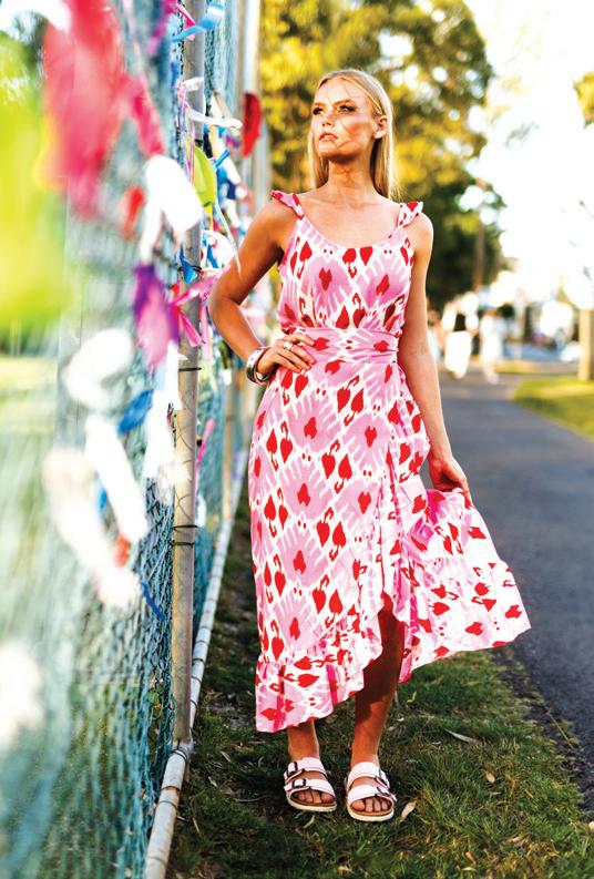 HAYLEY WEARS new season’s maxi print dress featuring pink piping on edges and crisscross detail at the back from European Labels exclusive in Australia at Eliza’s Boutique, 0459 076 165.