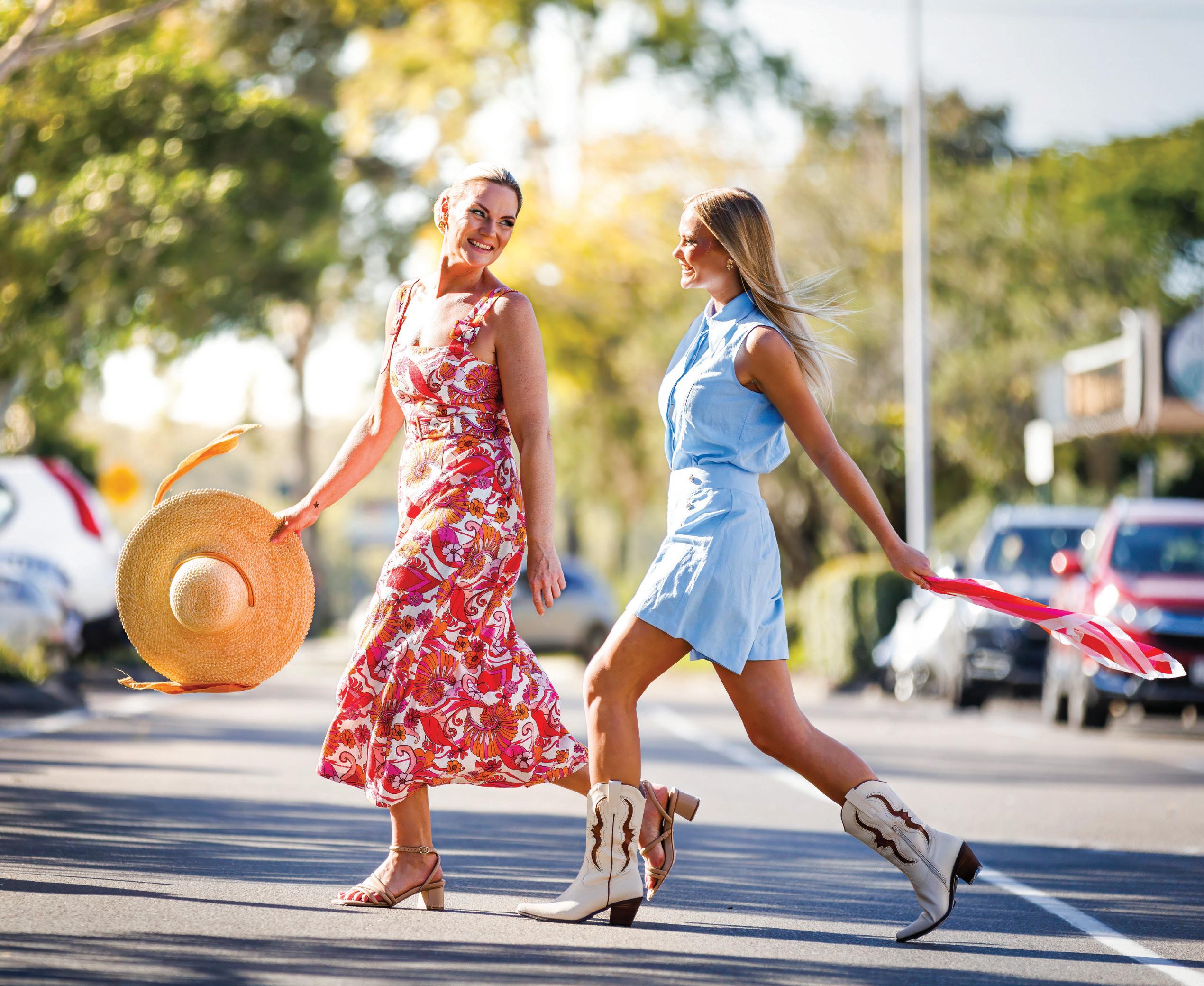 LILY WEARS Teneriffe shirt and Emmy shorts in Baby Blue and earrings from Wacker Clothing Company, wackerclothingcompany.com.au Carter Western boots from Sportsgirl and scarf from Big W, Noosa Civic LOCATION: Thomas St, Noosaville