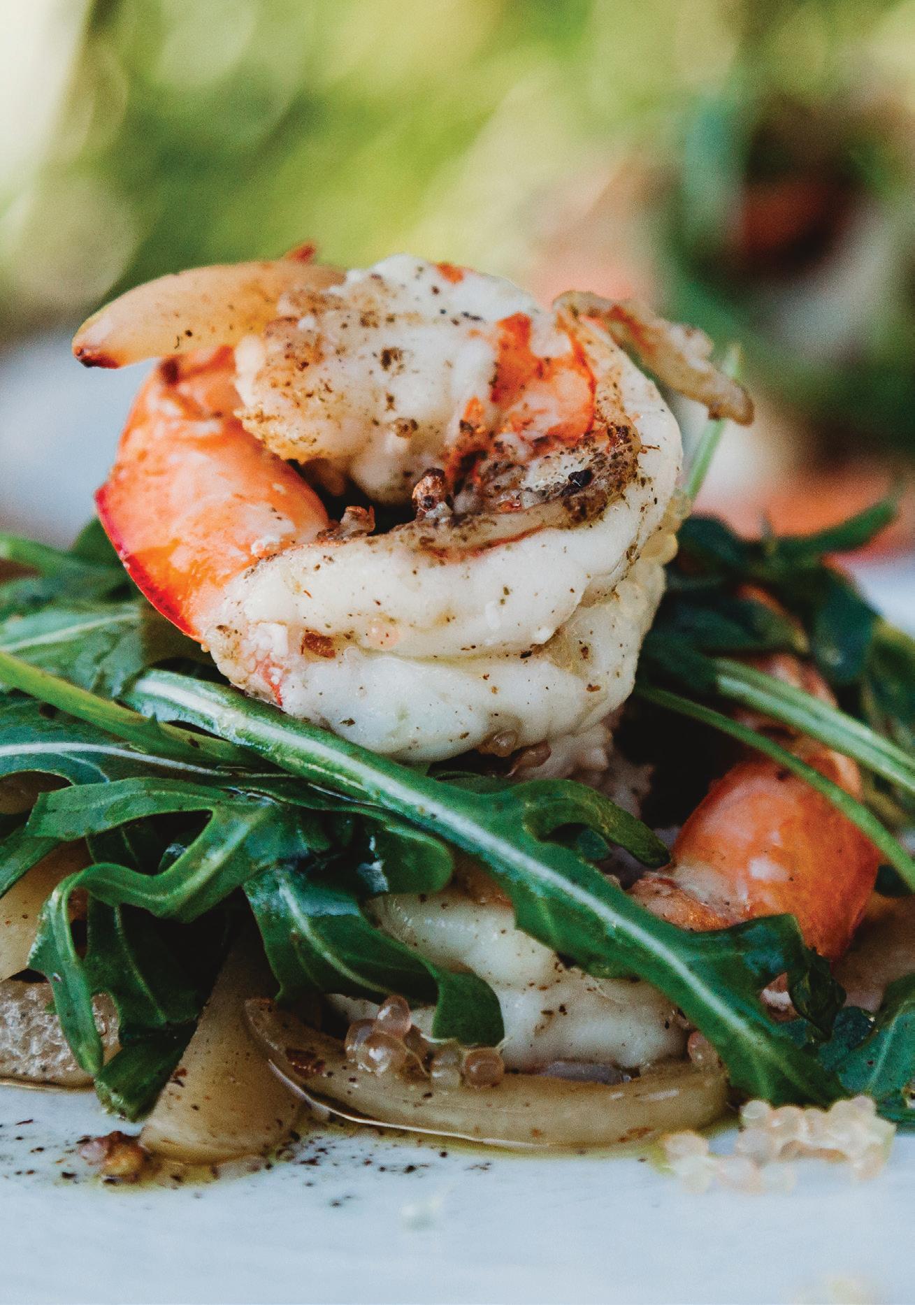 • Fry the prawns quickly on both sides and add to the spinach and rocket with the bunya nuts and saltbush leaves.
