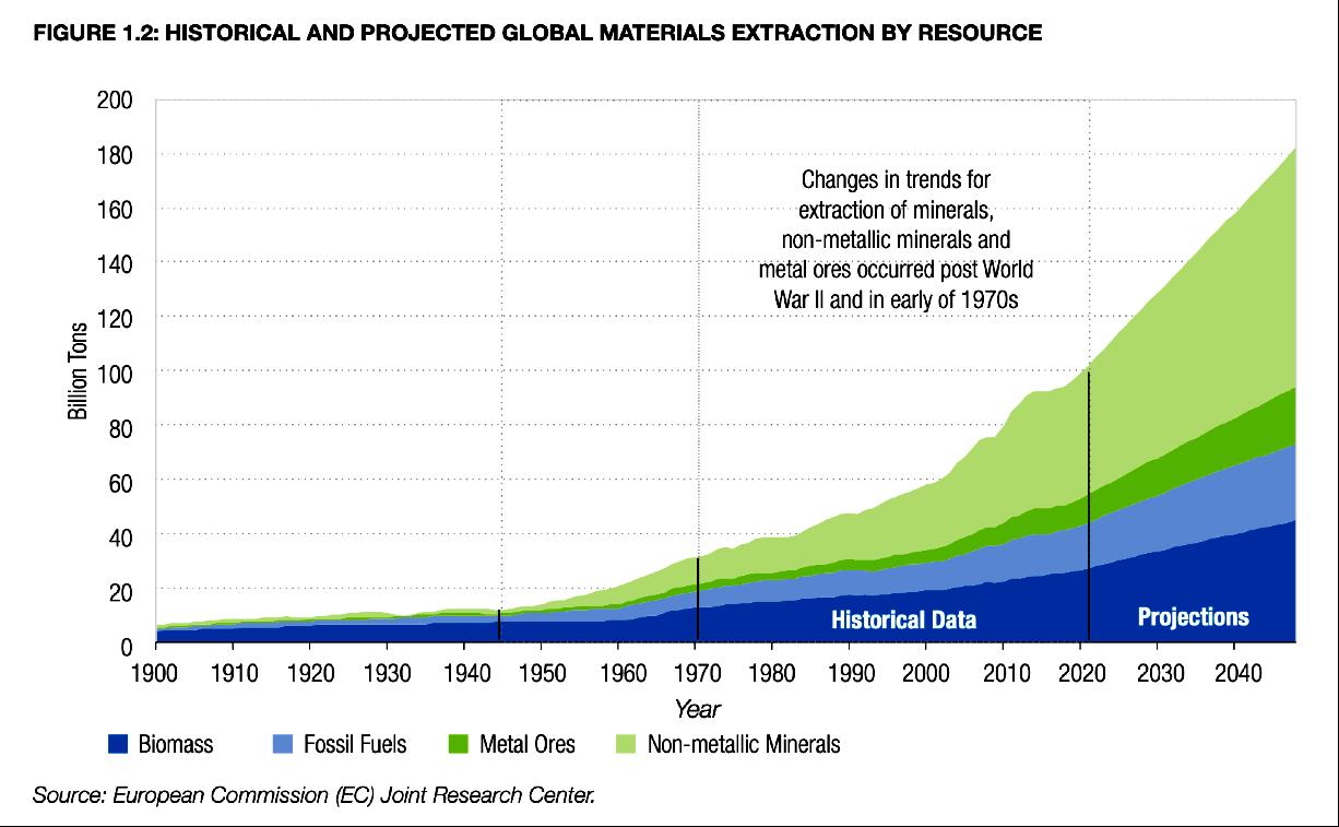 De acuerdo con los datos del European Commission's Joint Research Centre, la tendencia histórica extractivista instalada después de la II guerra mundial no da señales de desaceleración, y se estima que aproximadamente un 70% de los GEI producidos se asociarían con la extracción y procesamiento de materias primas (Fig 2).