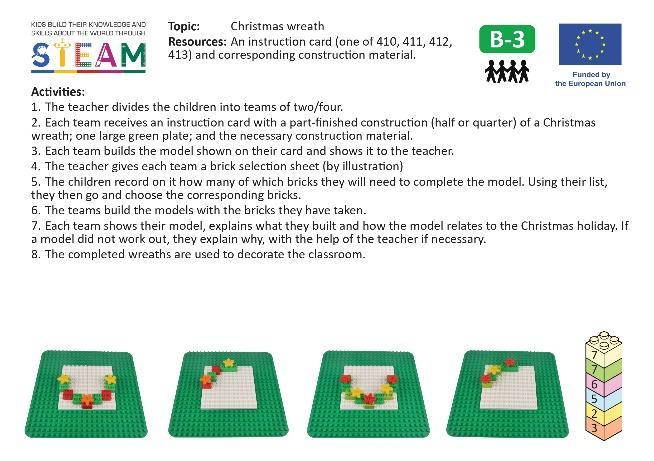 • providing the necessary support materials for the children. Depending on the chosen topic, these could be instruction cards (hard copy or as a projection), activity cards, block description sheets, pencils, etc.;