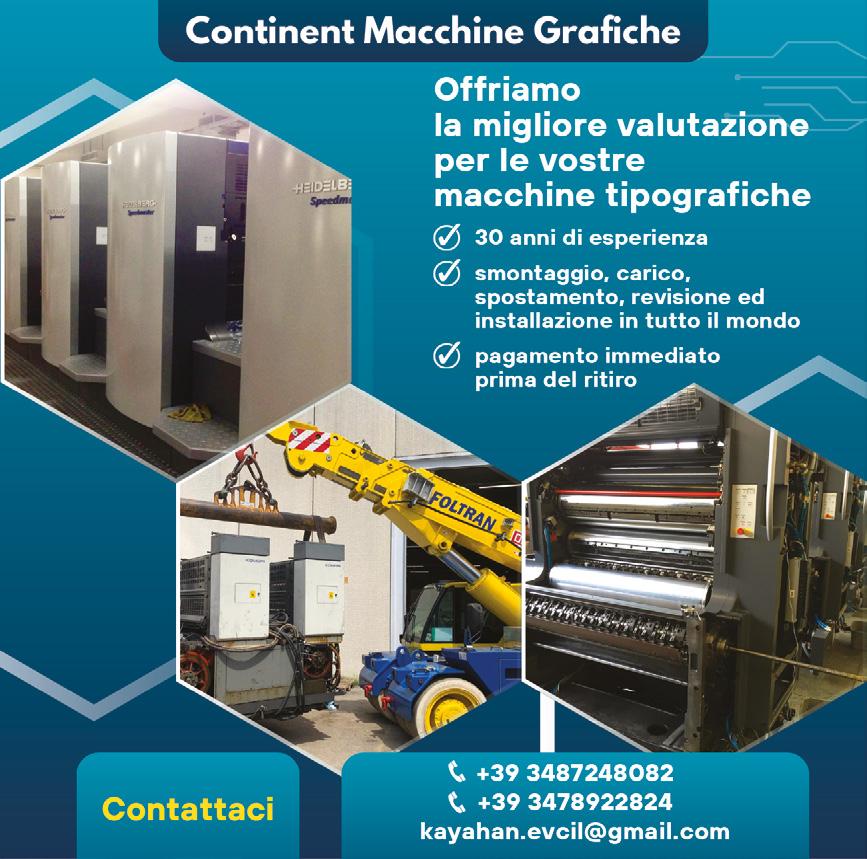 VENDESI Rotativa Solna, anni di costruzione 1977-2010. # Elementi di stampa n.10: n.5 D30 e n.5 D25; # n.5 2+1 e n.5 1+1; # Piega lastre - alberi e carrelli per bobine; # n.5 sbobinatori Amal; # Pronta per stampare quotidiani, libri e periodici senza forno; # Giro cilindri: 63 cm; # Compressore per aria compressa Balma C25; # CtP Thermal News; # Stacker Muller Martini CS 25; # n.4 Pompe per inchiostro. Si parte da un prezzo base di Euro 80.000. Per info: 3387118835