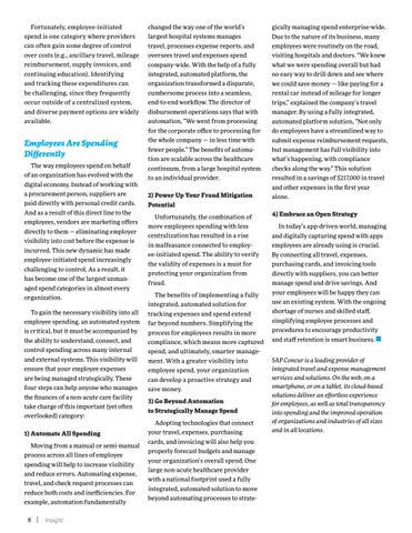 3) Go Beyond Automation to Strategically Manage Spend Adopting technologies that connect your travel, expenses, purchasing cards, and invoicing will also help you properly forecast budgets and manage your organization’s overall spend. One large non-acute healthcare provider with a national footprint used a fully integrated, automated solution to move beyond automating processes to strate-