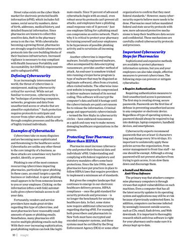 Important Cybersecurity Steps for Pharmacies Sophisticated and expensive methods are available to protect pharmacy information systems, but you and your employees can also take simple, effective measures to prevent cybercrimes. The following steps can prevent or mitigate cyberattacks: • Require Authentication Requiring authentication measures to limit unauthorized access is paramount. The first step is creating strong, secure passwords. Passwords are the first line of defense in preventing unauthorized access to any computer or electronic device. Regardless of type of operating system, a password should always be required to log into desktops, laptop computers, handheld devices, and smartphones. Cybersecurity experts recommend passwords that are at least 12 characters long and change every 30 to 60 days. It’s important to unilaterally apply these policies across the organization, from senior management to front-line staff – no one should be exempt. Although a strong password will not prevent attackers from trying to gain access, it can slow them down and discourage them. • Install and Maintain Anti-Virus Software The primary way that attackers compromise pharmacy computers is through viruses that exploit vulnerabilities on such machines. Even a computer that has all the latest security updates to its operating system and applications may still be at risk because of previously undetected flaws. In addition, computers can become infected by seemingly innocent outside sources, such as CDs, email, flash drives, and Web downloads. It is important to thoroughly research which antivirus software is right for your pharmacy and to make sure it is always kept up-to-date.