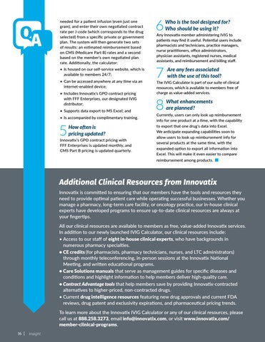 needed for a patient infusion (even just one gram), and enter their own negotiated contract rate per J-code (which corresponds to the drug selected) from a specific private or government plan. The system will then generate two sets of results: an estimated reimbursement based on CMS (Medicare Part B) rates and a second based on the member’s own negotiated plan rate. Additionally, the calculator: • Is housed on our self-service website, which is available to members 24/7; • Can be accessed anywhere at any time via an internet-enabled device; • Includes Innovatix’s GPO contract pricing with FFF Enterprises, our designated IVIG distributor; • Supports data export to MS Excel; and • Is accompanied by complimentary training.