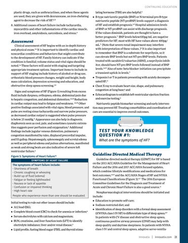 Assessment Clinical assessment of HF begins with an in-depth history and physical exam.2,6 It is important to identify cardiac and noncardiac conditions and behaviors that might contribute to the development of HF. Family history can indicate if the condition is familial; volume status and vital signs should be noted.2,6 These factors will assist with staging and targeting appropriate treatment options. Important items to include in support of HF staging include history of alcohol or drug use, orthostatic blood pressure changes, weight and height, body mass calculation, depression screening and education, and obstructive sleep apnea screening.2,6 Signs and symptoms of HF (Figure 5) resulting from excess fluid include dyspnea, orthopnea, edema, abdominal pain due to hepatic congestion, and abdominal distention.2,6,10 Reduction in cardiac output may lead to fatigue and weakness. 2,6,10 Other positive findings associated with vital signs, blood pressure, and pulse are resting sinus tachycardia and narrow pulse pressure, as decreased cardiac output is suggested when pulse pressure is below 25 mmHg. 6 Appearance can also help in diagnosis; diaphoresis seen as cool, pale, and sometimes cyanotic extremities suggests poor perfusion and oxygenation.6 Additional findings include jugular venous distention, pulmonary congestion manifested by rales, displaced precordial impulse, and S3 gallop. Hepatomegaly, splenomegaly and scrotal edema as well as peripheral edema and pulsus alternations, manifested as weak and strong beats are also indicative of severe left ventricular failure.6 Figure 5: Symptoms of Heart Failure10 SYMPTOMS OF HEART FAILURE