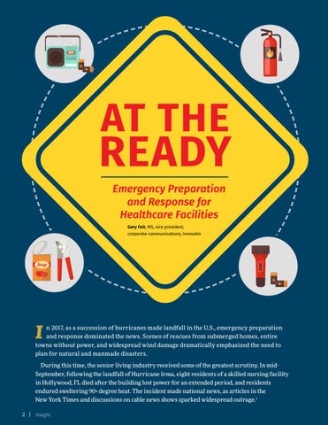 n 2017, as a succession of hurricanes made landfall in the U.S., emergency preparation and response dominated the news. Scenes of rescues from submerged homes, entire towns without power, and widespread wind damage dramatically emphasized the need to plan for natural and manmade disasters. During this time, the senior living industry received some of the greatest scrutiny. In midSeptember, following the landfall of Hurricane Irma, eight residents of a skilled nursing facility in Hollywood, FL died after the building lost power for an extended period, and residents endured sweltering 90+ degree heat. The incident made national news, as articles in the New York Times and discussions on cable news shows sparked widespread outrage.1