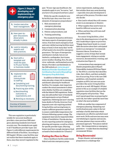ration requirements, making a plan that satisfies them may seem daunting – especially since plan development is only part of the process. Providers must also decide: • How (and to whom) they will communicate in an emergency or disaster; • What supplies they need to have on hand for different scenarios; and • When and how they will train staff and conduct drills. For senior living facilities, a first step in the planning process is to get the site’s leadership to agree on priorities. “Engage department heads in a round table discussion about their anticipated needs in an emergency,” recommends Sizewise’s Baron. From there, he suggests a series of steps that include team engagement, relying on outside resources, documentation, training, and evaluation (see Figure 2). A cornerstone of any emergency and disaster preparation plan is Hazard Vulnerability Analysis (HVA) (see Figure 3). The HVA is a tool that that identifies risks, their effects, and their probabilities of occurring. Prior to the new CMS guidelines, only hospitals needed to complete an HVA, but now non-acute providers like senior living facilities must do so as well. HD Supply’s Wicker points to this as an example of a helpful regulation since facilities that use the HVA properly will prioritize. “They won’t spend equal time on preparing for each risk, but rather spend the most time on what’s the most probable.” Drills are another key component of emergency planning. Simulating realworld situations puts a plan to the test and helps a facility determine which components are effective and which need more work. Drills and exercises may seem overwhelming to organize and execute, and some planners have success with a piecemeal approach. “Test pieces individually – like transportation or emergency generators – to make them less daunting,” recommends Wicker.