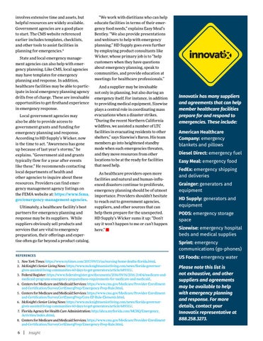 involves extensive time and assets, but helpful resources are widely available. Government agencies are a good place to start. The CMS website referenced earlier includes templates, checklists, and other tools to assist facilities in planning for emergencies.8 State and local emergency management agencies can also help with emergency planning. Like CMS, local agencies may have templates for emergency planning and response. In addition, healthcare facilities may be able to participate in local emergency planning agency drills free of charge. These are invaluable opportunities to get firsthand experience in emergency response. Local government agencies may also be able to provide access to government grants and funding for emergency planning and response. According to HD Supply’s Wicker, now is the time to act. “Awareness has gone up because of last year’s storms,” he explains. “Government aid and grants typically flow for a year after events like these.” He recommends contacting local departments of health and other agencies to inquire about these resources. Providers can find emergency management agency listings on the FEMA website at: https://www.fema. gov/emergency-management-agencies. Ultimately, a healthcare facility’s best partners for emergency planning and response may be its suppliers. While suppliers obviously sell products and services that are vital to emergency preparation, their offerings and expertise often go far beyond a product catalog.