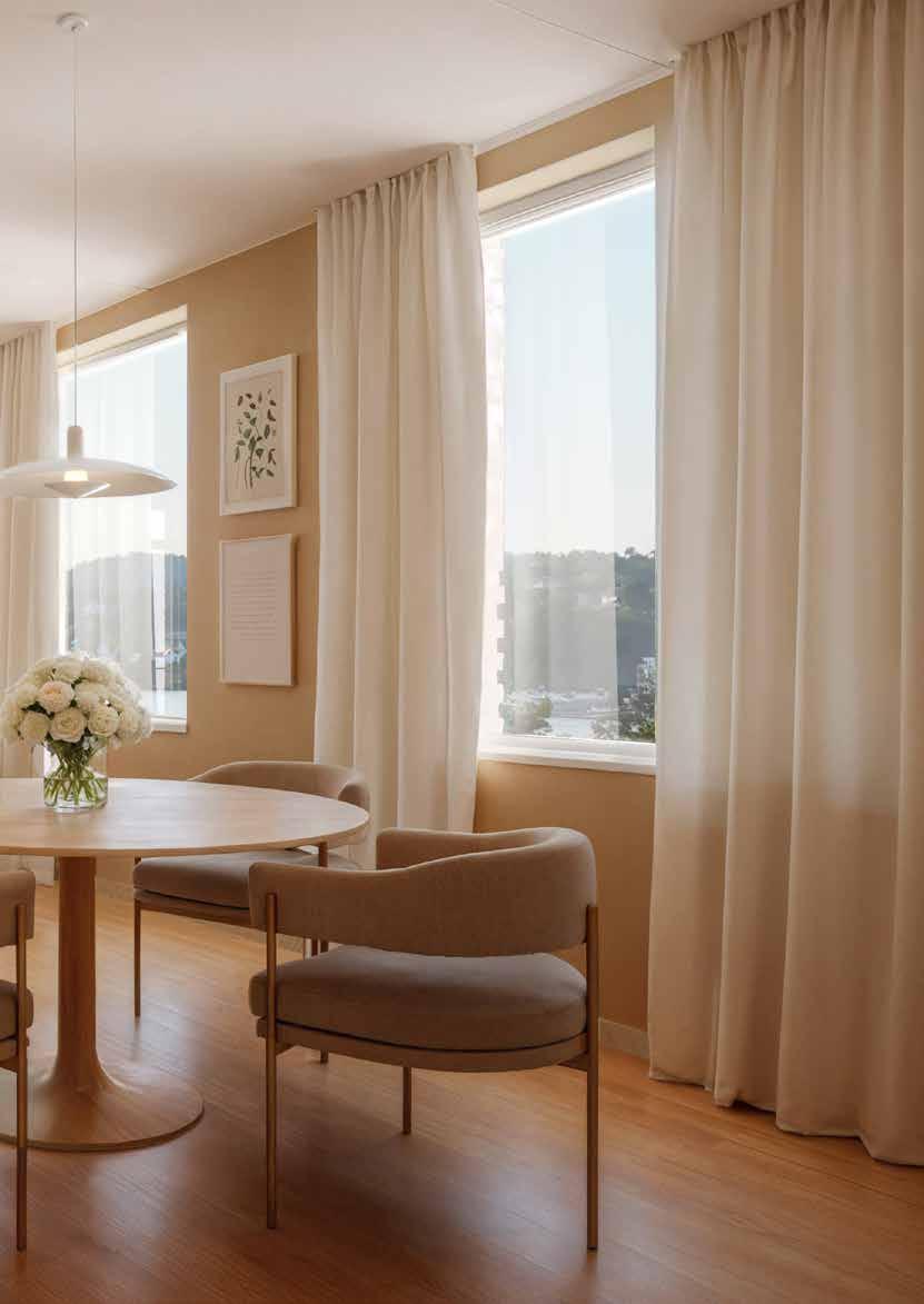 – Vi har jobbet mye med helheten for å skape et behagelig samspill i farger og materialer. Paletten er inspirert av varme, klassiske farger på eldre bygg i Arendal sentrum.