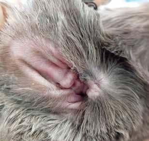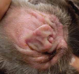 FOTO DI COPERTINA Orecchio destro di un Maltese con diagnosi di otite esterna eritemato-ceruminosa di tipo acuto, con presentazione bilterale, caratterizzata da importante edema e forte eritema. Foto di Luca Luciani.