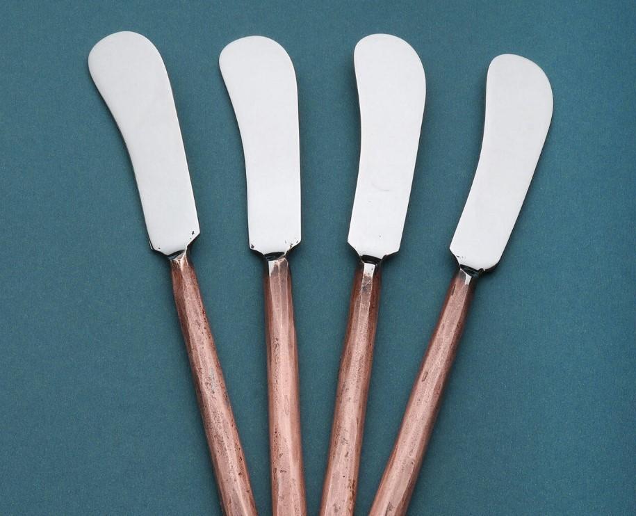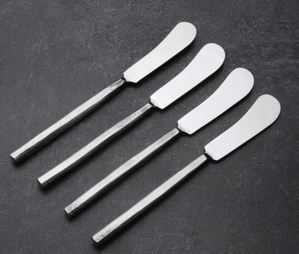 Set of butter knives are typically smaller and flatter than regular knives, with a dull edge and rounded tip.