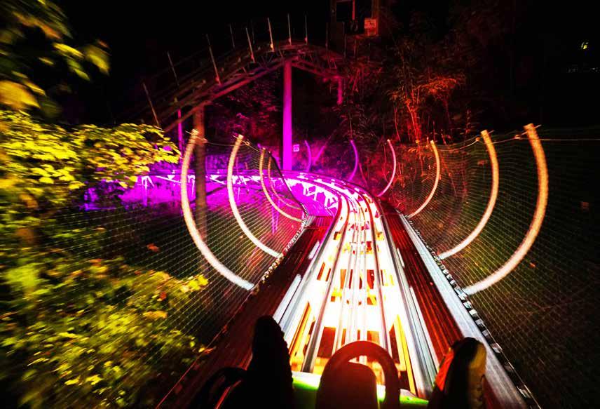 Gatlinburg’s first - and now newest, after a $2 million refit and upgradeMoonshine Mountain Coaster (the former Gatlinburg Mountain Coaster) is a unique, family-friendly thrill ride through 10 acres of woods in the Great Smoky Mountains, illuminated at night by SPRK Lighting. Photo courtesy SPRK
