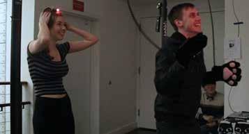 One player directs a laser mounted on their head. The other player attempts to catch the laser with their “paws” (soft mittens with light sensors sewn onto the back). Every time the sensors catch the laser, the Cat scores a point.