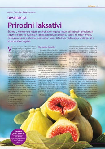 Prirodni laksativi Æivimo u vremenu u kojem su probavne tegobe jedan od najveÊih problema i sigurno jedan od najËeπÊih razloga dolaska u ljekarnu. Uzroci su naËin æivota, neodgovarajuÊa prehrana, nedovoljan unos tekuÊine, nedovoljno kretanja, ali i emocionalne tegobe. eÊ je 4 tisuÊljeÊa dobro poznato da zdravlje poËinje u crijevima. Zastojem fekalne mase moæe doÊi do autointoksikacije, jer se u crijevu zadræavaju toksiËni, razgradni produkti hrane, a neki od njih postaju i kancerogeni. Javljaju se prvi problemi: smanjuje se energija, dolazi do pojave kratkog daha koji joπ viπe umanjuje energiju, teπkoÊe u razmiπljanju, obloæen jezik, stvaraju se divertikli... »est uzrok opstipacije je naËin æivota - neodgovarajuÊa prehrana, nedovoljan unos tekuÊine, nedovoljno kretanja, ali i emocionalne i psiholoπke tegobe. Prvo πto Ëinimo u tim sluËajevima je uzimanje laksativa. Meutim, vrlo je vaæan pravilan odabir, jer neodgovarajuÊi pripravak ili lijek moæe rezultirati s joπ viπe problema i potpunim prestankom prirodnog nagona za praænjenjem crijeva. Priroda nudi veliki broj moguÊnosti. Prema mehanizmu djelovanja, prirodne laksative moæemo podijeliti u nekoliko skupina: 1. Kontaktni laksativi 2. Stimulatori miπiÊa tankog i debelog crijeva 3. MehaniËki laksativi 4. Osmotski laksativi 5. Emolijentni laksativi 6. Probiotici i prebiotici