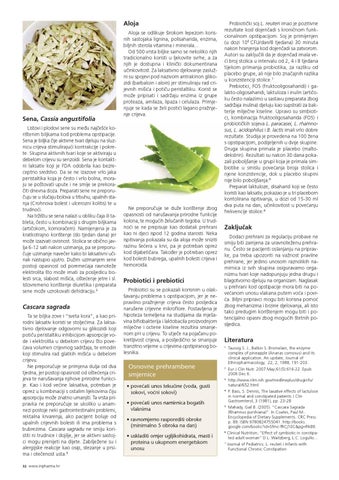 Cascara sagrada Ta se biljka zove i “sveta kora“, a kao prirodni laksativ koristi se stoljećima. Za laksativno djelovanje odgovorni su glikozidi koji potiču peristaltiku inhibicijom apsorpcije vode i elektrolita u debelom crijevu što povećava volumen crijevnog sadržaja, te emodin koji stimulira rad glatkih mišića u debelom crijevu. Ne preporučuje se primjena dulja od dva tjedna, jer postoji opasnost od oštećenja crijeva te narušavanja njihove prirodne funkcije. Kao i kod većine laksativa, potreban je oprez u kombinaciji s ostalim lijekovima čiju apsorpciju može znatno umanjiti. Ta vrsta pripravka ne preporučuje se ukoliko u anam nezi postoje neki gastrointestinalni problemi, rektalna krvarenja, ako pacijent boluje od upalnih crijevnih bolesti ili ima problema s bubrezima. Cascara sagradu ne smiju koristiti ni trudnice i dojilje, jer se aktivni sastojci mogu prenijeti na dijete. Zabilježene su i alergijske reakcije kao osip, stezanje u prsima i otečenost usta.5 32 www.inpharma.hr