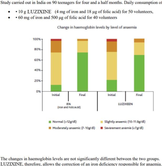 The observational data gathered on the ground in Peru, India and the Congo has highlighted an improvement in the state of health of undernourished populations as a result of consuming 10g Luzixine™, the main effect of which are as follows: • An improvement in cases of anaemia caused by an iron deficiency (Figure 4), • An acceleration in stature-ponderal growth in children and adolescents (Figure 5), • A reduction in respiratory infections and chronic diarrhoea