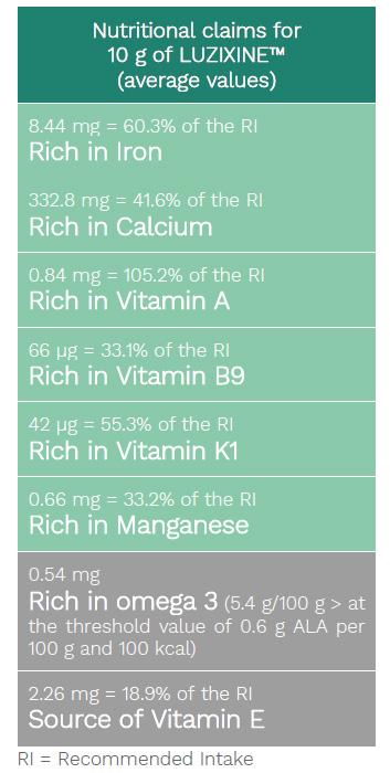 A daily intake of 10g (maximum dose) of Luzixine™ significantly contributes to the recommended daily intake not only of proteins but also of iron, calcium, manganese, omega 3, vitamins A, B9, K1, and E (Figure 2).