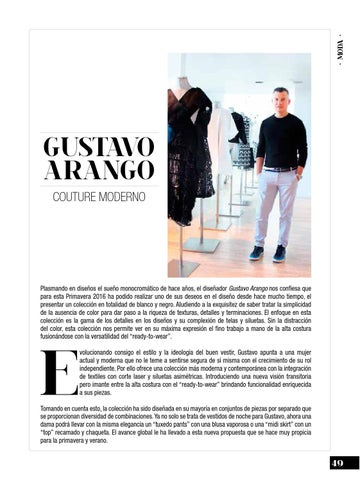 volucionando consigo el estilo y la ideología del buen vestir, Gustavo apunta a una mujer actual y moderna que no le teme a sentirse segura de sí misma con el crecimiento de su rol independiente. Por ello ofrece una colección más moderna y contemporánea con la integración de textiles con corte laser y siluetas asimétricas. Introduciendo una nueva visión transitoria pero imante entre la alta costura con el “ready-to-wear” brindando funcionalidad enriquecida a sus piezas.