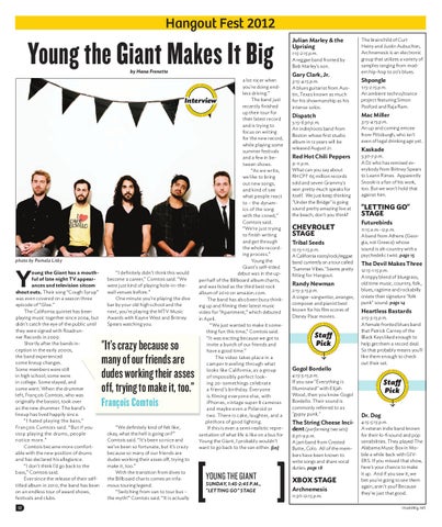 a lot nicer when you’re doing endless driving.” The band just Interview recently finished up their tour for their latest record and is trying to focus on writing for the new record, while playing some summer festivals and a few in between shows. “As we write, we like to bring out new songs, and kind of see what people react to – the dynamics of the song with the crowd,” Comtois said. “We’re just trying to finish writing and get through the whole recording process.” Young the Giant’s self-titled “I definitely didn’t think this would debut was in the upbecome a career,” Comtois said. “We per half of the Billboard album charts, were just kind of playing hole-in-theand was listed as the third best rock wall venues before.” album of 2010 on amazon.com. One minute you’re playing the dive The band has also been busy thinkbar by your old high school and the ing up and filming their latest music next, you’re playing the MTV Music video for “Apartment,” which debuted Awards with Kayne West and Britney in April. Spears watching you. “We just wanted to make it something fun this time,” Comtois said. “It was exciting because we got to invite a bunch of our friends and have a good time.” The video takes place in a camper traveling through what looks like California, as a group of impossibly perfect looking 20-somethings celebrate a friend’s birthday. Everyone is filming everyone else, with iPhones, vintage super 8 cameras and maybe even a Polaroid or two. There is cake, laughter, and a plethora of good lighting. “We definitely kind of felt like, If this is even a semi-realistic repreokay, what the hell is going on?” sentation of what life is like on a bus for Comtois said. “It’s been so nice and Young the Giant, I probably wouldn’t we’ve been so fortunate, but it’s crazy want to go back to the van either. {in} because so many of our friends are dudes working their asses off, trying to make it, too.” With the transition from dives to the Billboard charts comes an infaSUNDAY, 1:45-2:45 P.M., mous touring legend. "LETTING GO" STAGE “Switching from van to tour bus –