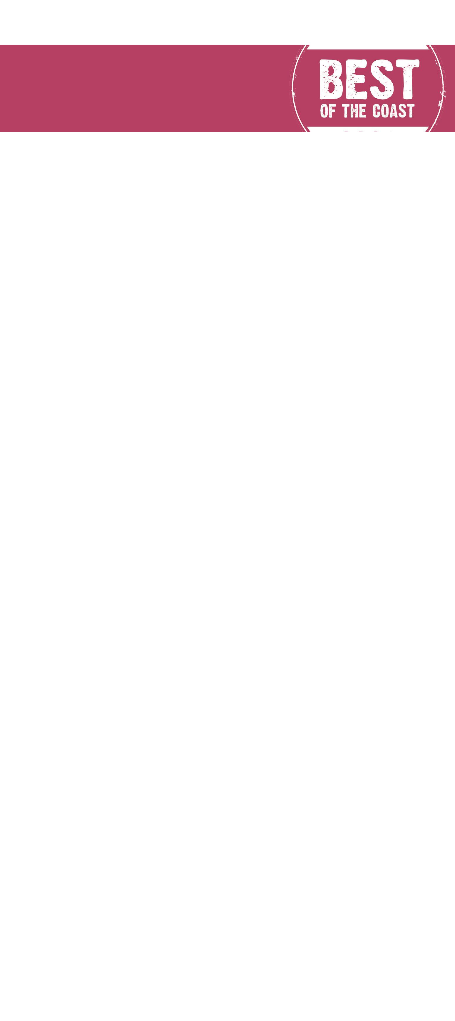 Last week we printed 84 pages, but even that wasn't enough to cover all the Best of the Coast bases. So we're back for round two: Rest of the Best. In this issue, we're celebrating the runners-up and giving them their own moment in the spotlight. We count the votes, which means we know just how competitive some of the categories are (looking at you, Best Taco). That's why we think each and every business that earned a spot on the list should be celebrated. {in}
