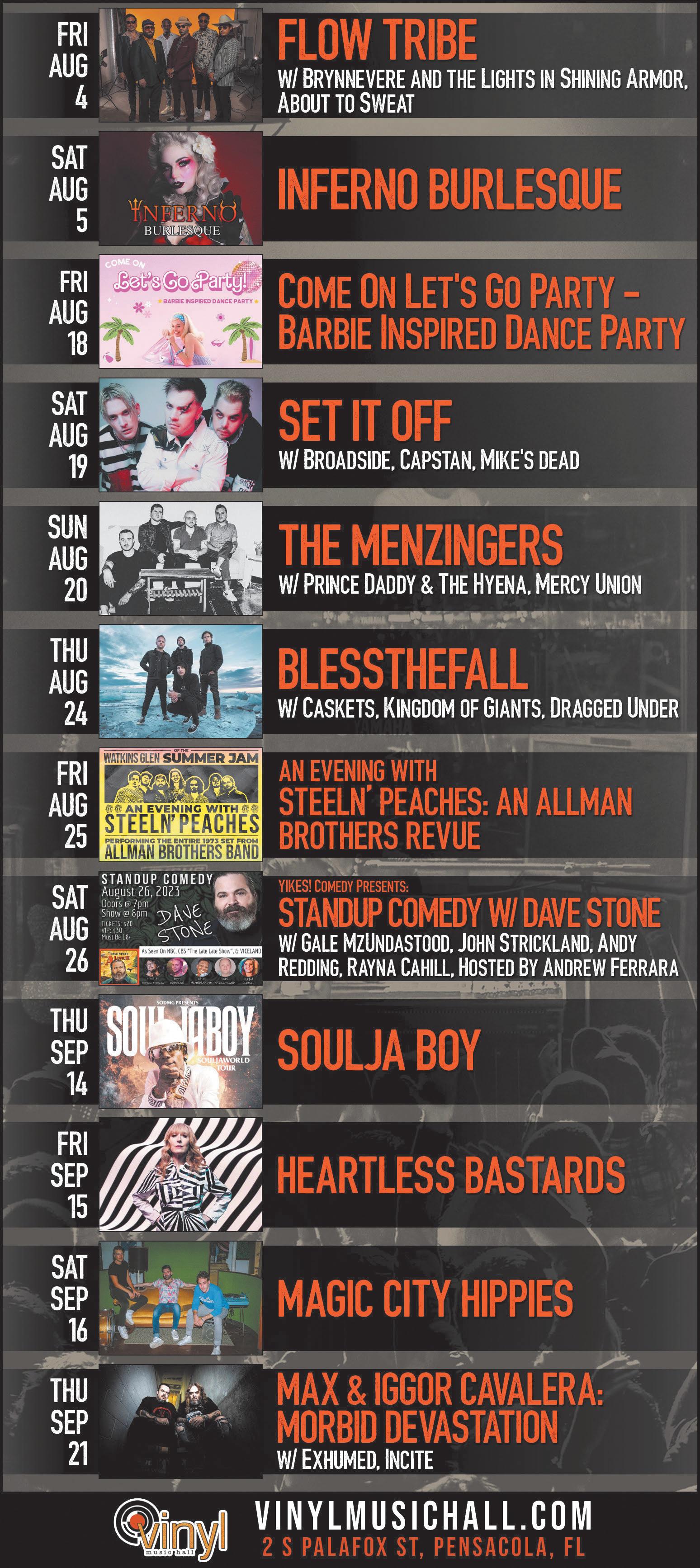 INFERNO BURLESQUE Show is 7 p.m. Saturday, Aug. 5 at Vinyl Music Hall, 2 S. Palafox. Tickets are $25-$500 and available at vinylmusichall.com.