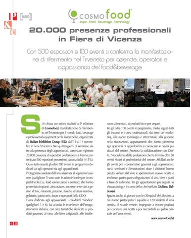 ranze alimentari, ai prodotti bio e per vegani. Tra gli oltre 100 eventi in programma, molto seguiti tutti gli incontri e i corsi professionali, dai temi del marketing, alle nuove tecnologie e attrezzature, alla gestione nella ristorazione, appuntamenti che hanno permesso agli operatori di approfondire e conoscere le novità più attuali del settore. Preziosa la collaborazione con Dieffe, l’Accademia delle professioni che ha firmato oltre 30 eventi rivolti ai professionisti del settore. Affollati anche gli eventi per i consumatori gourmet e gli appassionati: corsi, seminari e dimostrazioni dove i visitatori hanno potuto vedere dal vivo e sperimentare nuove ricette e tendenze, partecipare a degustazioni di vini, birre e piatti a base di zafferano. Tra gli appuntamenti più seguiti, lo showcooking e il corso dello chef stellato Giuliano Baldessari. Spazio anche ai giovani con le Olimpiadi dei Mestieri, a cui hanno partecipato 9 squadre e 120 studenti di una ventina di scuole venete, impegnate a trovare prodotti per cucinare una ricetta e poi raccontarla sul palco centrale dell’area eventi. www.cosmofood.it