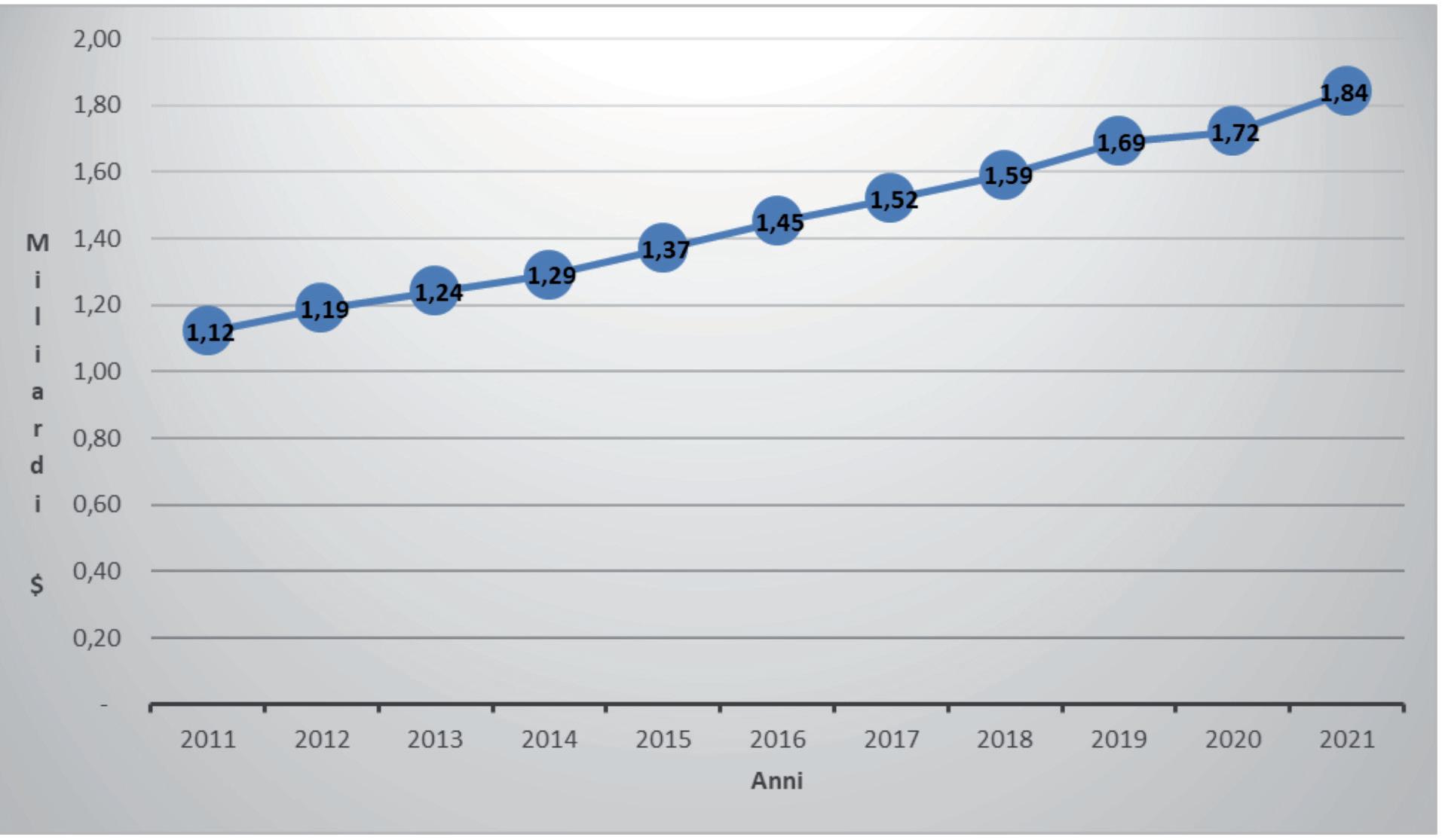 crescere ad un tasso medio annuo del 4,9%, non dissimile da quello registrato nel corso dell’ultimo de cennio, per arrivare ad attestarsi a 2,23 miliardi di dollari nel 2025. I pa esi a tasso di crescita più elevato sa ranno ancora quelli asiatici, in parti colare Cina e India (tabella 7).