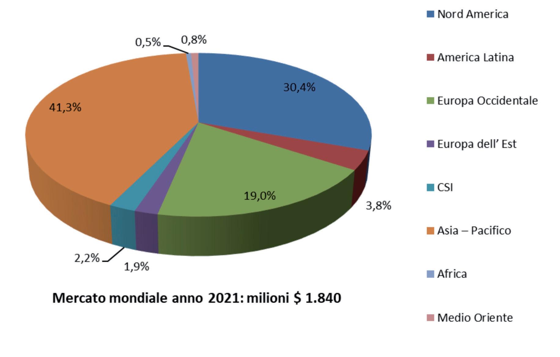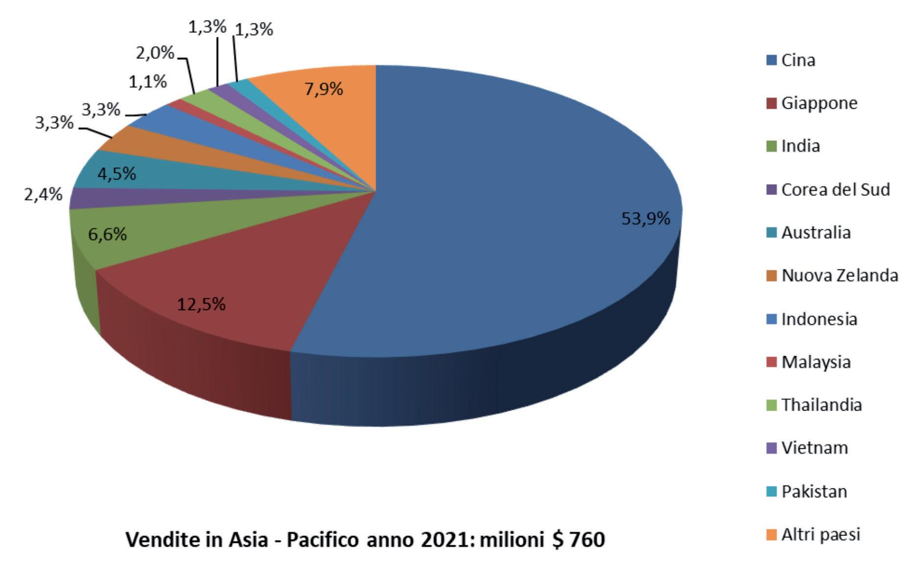 Tabella 6 - Il mercato degli enzimi per impieghi alimentari in Asia – Pacifico: anno 2021