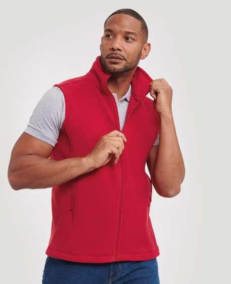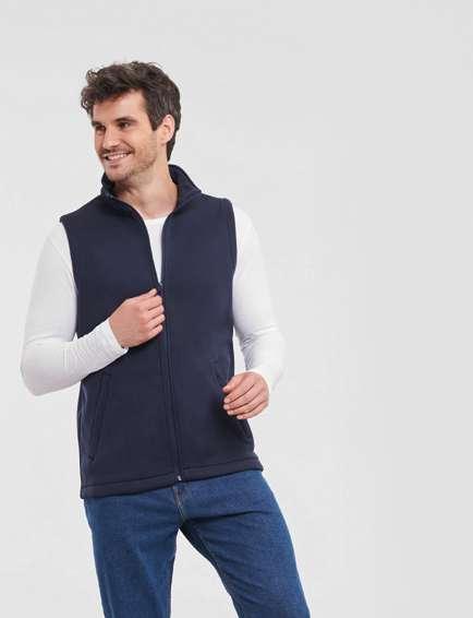 Gilet Workshell con bordino sul petto riflettente. Una tasca sul petto e due laterali con cerniera. Tessuto antivento repellente all’acqua e resistente allo strappo con membrana interna traspirante e isolante e interno termico.