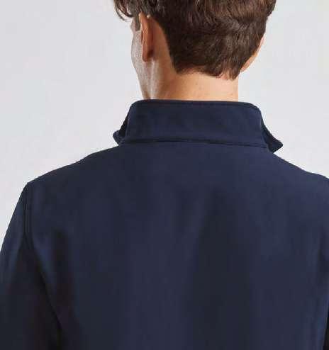 Piping tricolore su colletto e su giromanica. Chiusura a due bottoni in tinta. Costina 1x1 su collo e giromanica. Spacchetti laterali rinforzati con piping tricolore