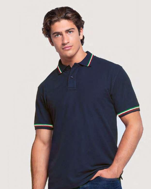 DESCRIZIONE: Polo uomo manica lunga piqué Piping tricolore su colletto e su giromanica. Chiusura a due bottoni in tinta. Costina 1x1 su collo e giromanica. Spacchetti laterali rinforzati con piping tricolore COMPOSIZIONE: 100% Cotone pettinato preristretto GRAMMATURA: 210 g/m².