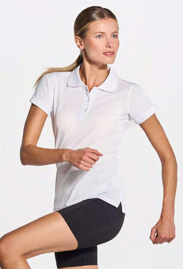 Polo donna manica corta semi-attillata. Tessuto piqué. Bottoni dello stesso colore della Polo. Abbottonatura con 3 bottoni. Collo e bordo manica in costina 1X1. Spacchetti laterali.