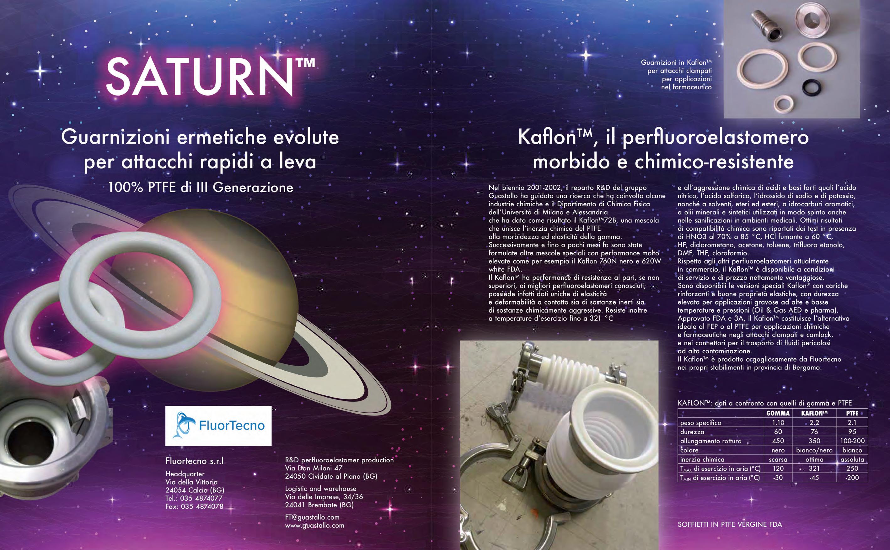 I dati mostrati in questa brochure sono ricavati da test effettuati in laboratorio. Le proprietà e le applicazioni mostrate in questa brochure sono standardizzate. Le specifiche applicazioni non possono essere ricavate senza un’analisi e valutazioni specifiche. In presenza di fluidi particolarmente aggressivi e vapore, le temperature massime dovranno essere ridotte di circa un 25% Vi raccomandiamo quindi di contattare gli uffici Fluortecno per maggiori informazioni.