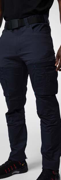 Pantaloni elasticizzati e traspiranti. Aperture laterali con zip per ventilazione. Scomparti e tasche porta attrezzi. Vano per smartphone e porta-badge. Tasche e battitacco rinforzati in Cordura Ginocchia sagomate e rinforzate in Kevlar elasticizzato, con porta ginocchiere. Predisposizione per accessori MOLLE-system. Inserti rifrangenti. Orlo regolabile.