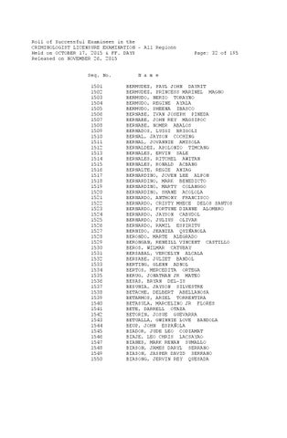 Roll of Successful Examinees in the CRIMINOLOGIST LICENSURE EXAMINATION - All Regions Held on OCTOBER 17, 2015 & FF. DAYS Released on NOVEMBER 26, 2015 Seq. No. 1501 1502 1503 1504 1505 1506 1507 1508 1509 1510 1511 1512 1513 1514 1515 1516 1517 1518 1519 1520 1521 1522 1523 1524 1525 1526 1527 1528 1529 1530 1531 1532 1533 1534 1535 1536 1537 1538 1539 1540 1541 1542 1543 1544 1545 1546 1547 1548 1549 1550