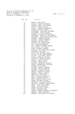 Roll of Successful Examinees in the MIDWIFE LICENSURE EXAMINATION Held on NOVEMBER 7 & 8, 2015 Released on NOVEMBER 11, 2015 Seq. No. 51 52 53 54 55 56 57 58 59 60 61 62 63 64 65 66 67 68 69 70 71 72 73 74 75 76 77 78 79 80 81 82 83 84 85 86 87 88 89 90 91 92 93 94 95 96 97 98 99 100